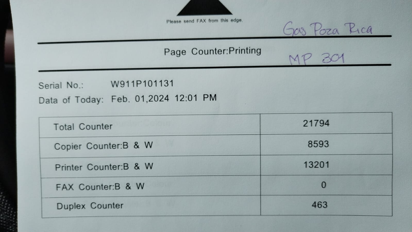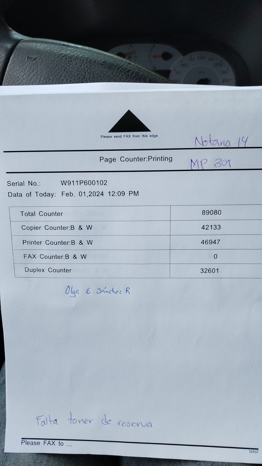 Revisar equipo por goma fuera de su lugar. No saben si hay t?ner de reserva, no se encontraba la recepcionista.